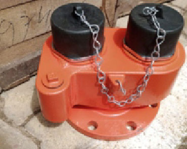 Durable Wye female connector with cap, used to split water flow from a single source into two outlets. Ideal for fire hose systems, ensuring efficient distribution and secure connections with protective caps.
